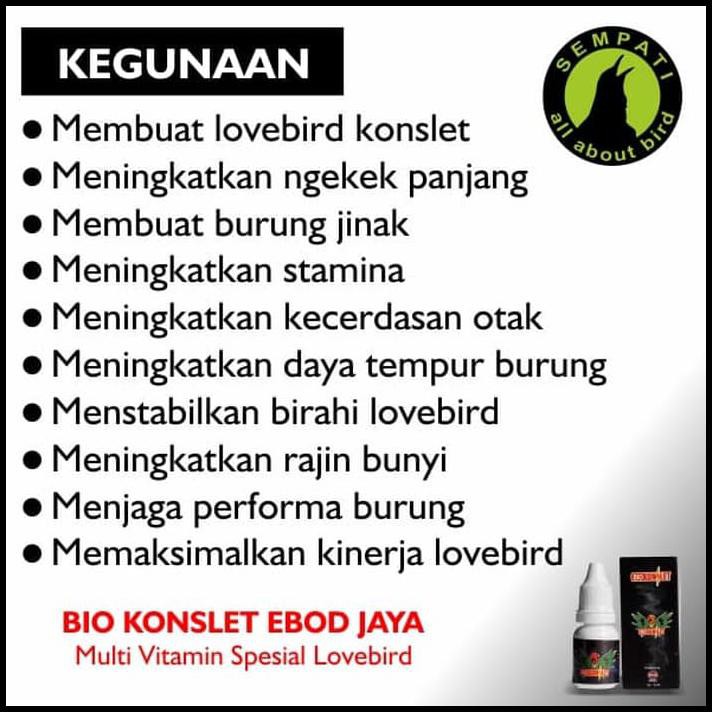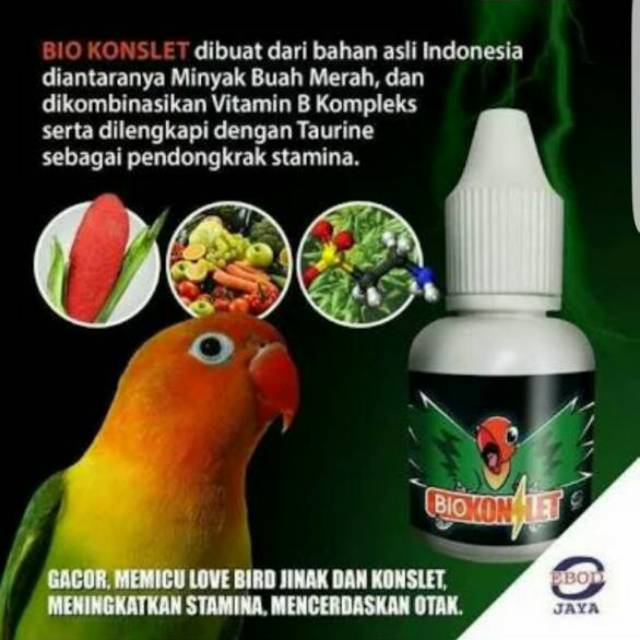 Berikan setelah burung beres di jemur untuk mencegah berkurangnya kasiat bio konslet akibat terkena sengatan sinar matahari secara langsung. Can launch a bird s breathing. Kelebihan bio konslet juga terdapat dari bahan bakunya yang alami terbuat dari minyak buah merah asli papua dan ditambah berbagai macam vitamin yang bersumber dari bahan alami juga jadi sangat aman untuk digunakan jangka pajang kepada burung kita tanpa takut ada efek samping yang ditimbulkan dari bahan kimia. Belanja bio konslet ebod jaya vitamin burung meningkatkan kegacoran kecerdasan stamina menjadikan burung jinak.