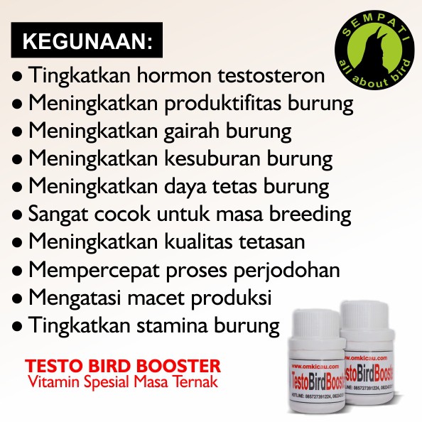 Jual testobird booster plus panduan obat burung macet bird boster tbb dengan harga rp75 000 dari toko online toko sanjaya kota probolinggo. Cari produk obat vitamin burung lainnya di tokopedia. Inti artikel tersebut adalah pertama burung dengan kegacoran minim bisa dikembalikan kegacorannya dengan pemberian testosteron dan kedua testosteron sangat diperlukan untuk membuat burung menyuarakan lagu. Dosis dan cara pemakaian unggas umur 4 6 minggu 25 ml dilarutkan dalam 2 5 liter air minum untuk 100 ekor ayam umur 6 minggu keatas 50 ml dilarutkan dalam 5 8 liter air minum untuk 100 ekor ayam.