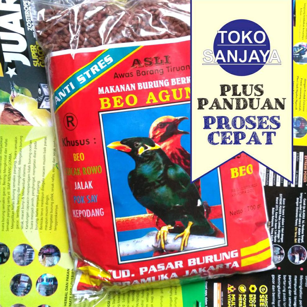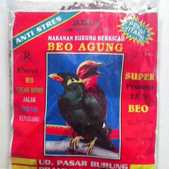 Pakan burung beo. Jenis burung beo termasuk jenis burung berukuran sedang atau besar dengan panjang tubuh sekitar 27 sampai 31 cm dengan berat tubuh sekitar 161 sampai 229 g. Untuk pakan burung beo sangat mudah kita dapat terutama di pasaran bahan di atas sudah tersedia dengan lengkap. Pastikan anda memberikan pakan seimbang pada burung beo anda. Warna warni campuran 3 warna atau lebih umur.