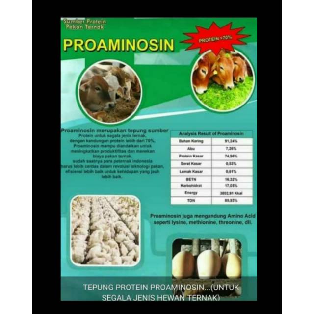 Sudah saatnya para peternak indonesia harus lebih cerdas dalam revolusi teknologi pakan efisiensi lebih baik untuk kehidupan yang jauh lebih baik. Dengan mengunakan tepung ikan tidak terdapat unsure lysine yang merangsang hewan untuk lapar sehingga untuk menambahkan lysine pabrik pakan ternak harus import dari germany. Proaminosin merupakan tepung sumber protein untuk segala jenis ternak dengan kandungan protein lebih dari 70 proaminosin mampu diandalkan untuk meningkatkan produktifitas dan menekan biaya pakan. Serbuk campuran pakan ternak tinggi protein hingga up 70 lemak dengan parameter pepsin 80 metabolisme energi yang tinggi 3500 calori gram asam amino lysine thereonin methionin dll dicampurkan dengan dedak rumput ampas tahu onggok atau konsentrat dll.