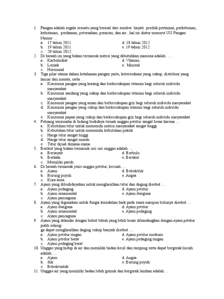 Soal soal prakarya dan kewirausahaan unggas petelur februari 04 2018 1. Soal uas teori kejuruan budidaya ternak unggas smk. Ayam petelur adalah ayam ayam betina dewasa yang dipelihara khusus untuk diambil telurnya. Jumlah soal sebanyak 40 butir pada setiap butir soal terdapat 5 lima pilihan jawaban.